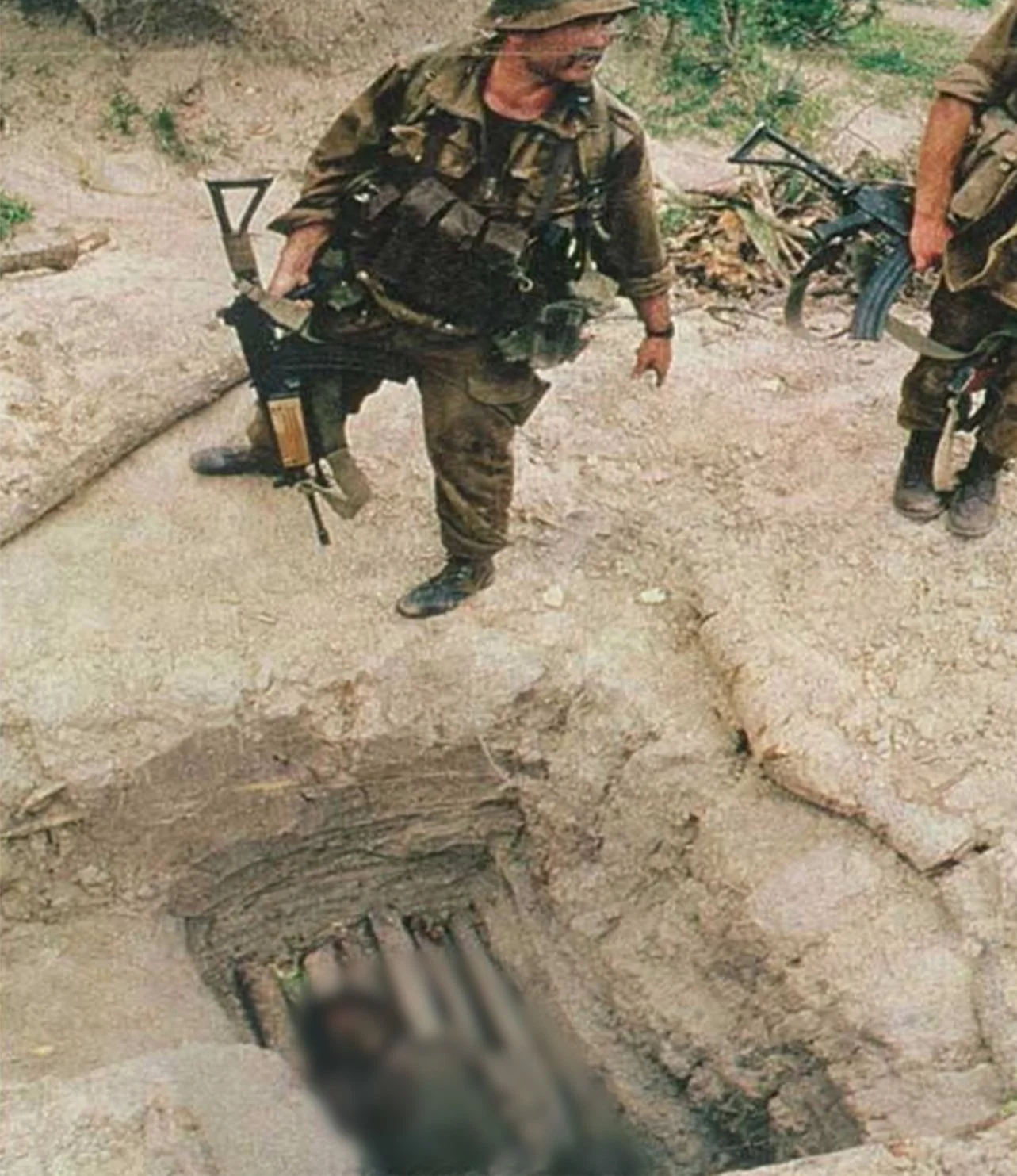 PHOTO: Peter, standing along a captured SWAPO trench, as he and the Paras consolidate around enemy position. A full front profile of Peter’s tactical loadout is visible. A deceased SWAPO fighter is seen in the trench, and blurred due to the graphic nature of the original photo. Photo taken by Al J. Venter.